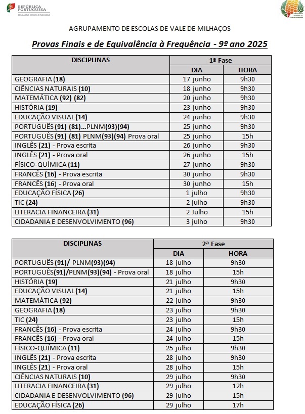 Provas de Avaliação Externa 2024 /2025 Calendário Informação prova por disciplina Inglês – Escrita (Informação prova) Inglês – Oral (Informação prova) Literacia financeira e qualidade de vida (Informação prova) Cidadania e Desenvolvimento (Informação prova) Físico-química (Informação prova) Ciências Naturais (Informação prova) Educação Visual (Informação prova) Francês – Escrita (Informação prova) Francês – Oral (Informação prova) Geografia (Informação prova) História (Informação prova) TIC (Informação prova) Português – Oral (Informação prova) Matemática (Informação prova) Educação Física (Informação prova)